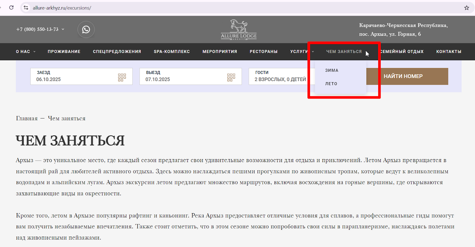 - Добавили недостающие разделы и страницы под важные темы. Например, на сайте изначально не было отдельных страниц про СПА-комплекс, рестораны, детский досуг – мы создали эти подразделы и наполнили их контентом. Появились страницы под запросы «SPA в Архызе», «ресторан Архыз Allure Lodge», «детский клуб в отеле Архыз» и т.д.
