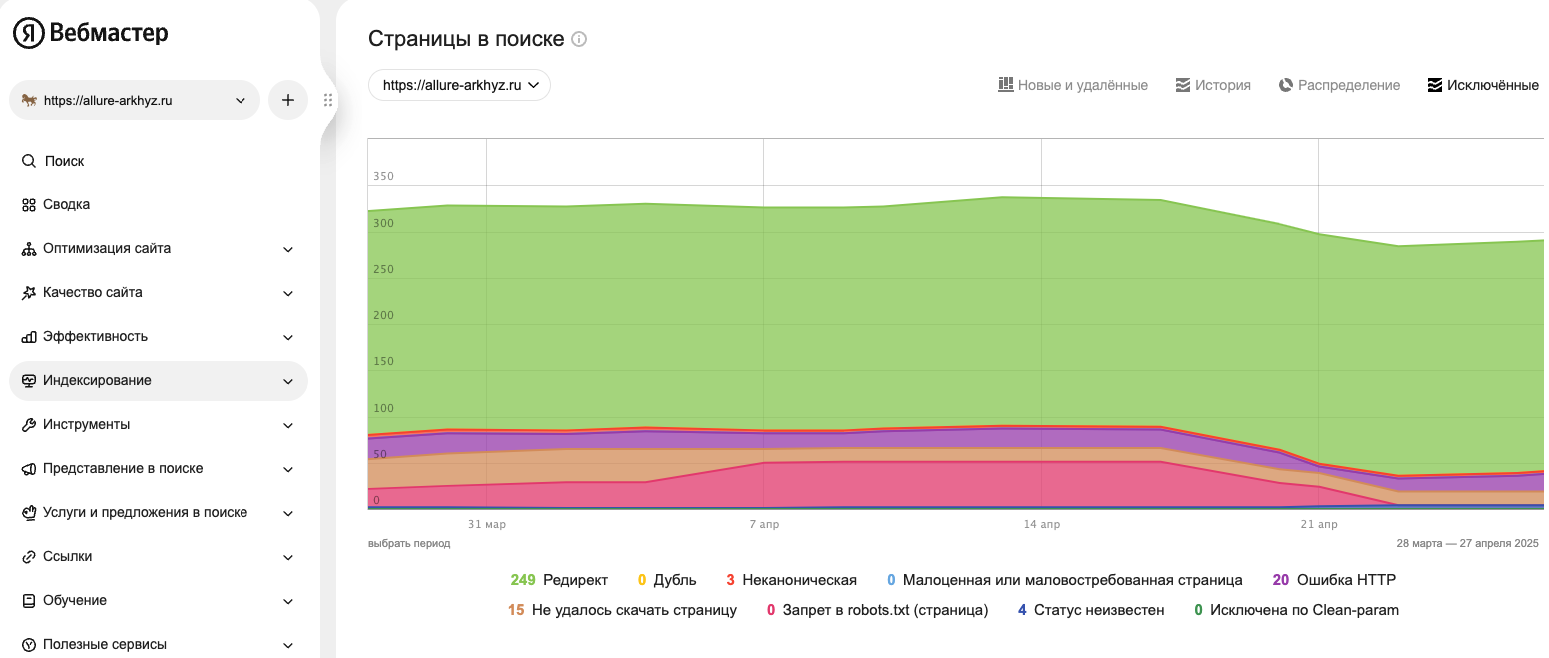 В панелях вебмастеров больше нет критических ошибок: дублированные мета-теги устранены, число 404-страниц сведено к нулю.
