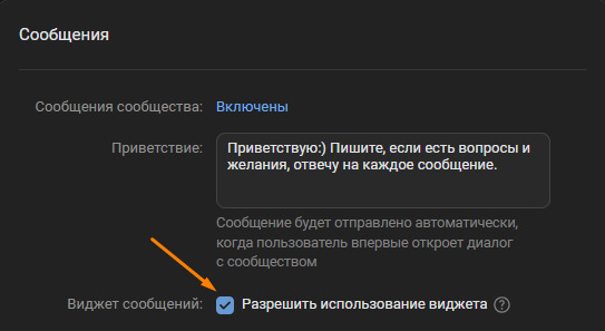 · Найдите в списке «Сообщения» и выберите опцию «Включить». Рядом вы можете выбрать, где именно разместить кнопку - в главном меню или под описанием группы.