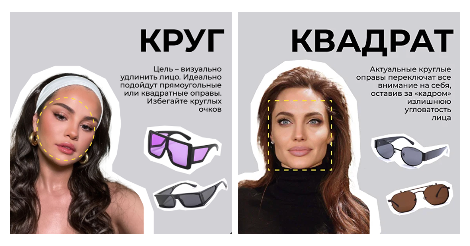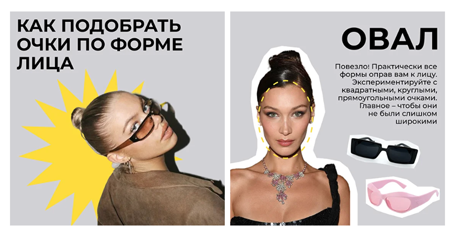 3. Практические советы. Выбор аксессуаров онлайн может быть сложным. Чтобы помочь аудитории, мы публиковали рекомендации по подбору очков к разным формам лица. Но вместо шаблонных советов мы использовали в качестве примеров образы известных и любимых селебрити.
