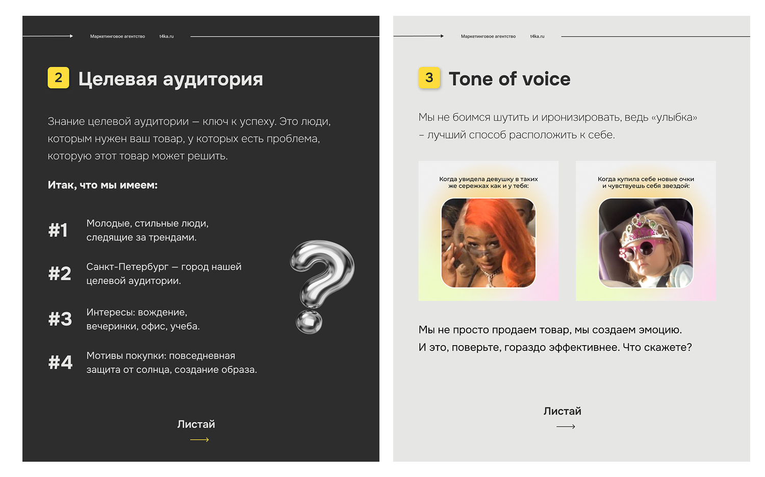 Миссия нашего клиента — помогать людям в самовыражении. Это не о продаже аксессуаров, а о трансляции идей «уверенности», «стиля», «индивидуальности». Поэтому простой дружелюбный тон — это лишь отправная точка.
