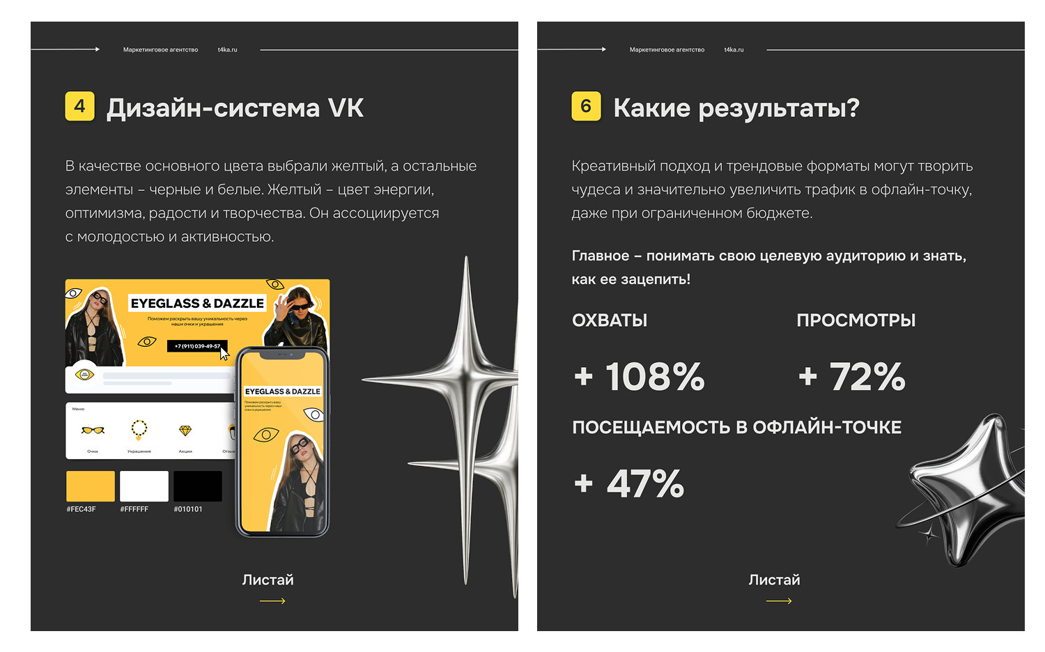 В качестве акцентного цвета был выбран желтый, а в качестве базовых — черный и белый. Желтый символизирует энергию, позитив, радость и креативность, идеально ассоциируясь с молодостью. К тому же, он создает отличный контраст с черно-белой палитрой, делая контент более выразительным и читабельным.
