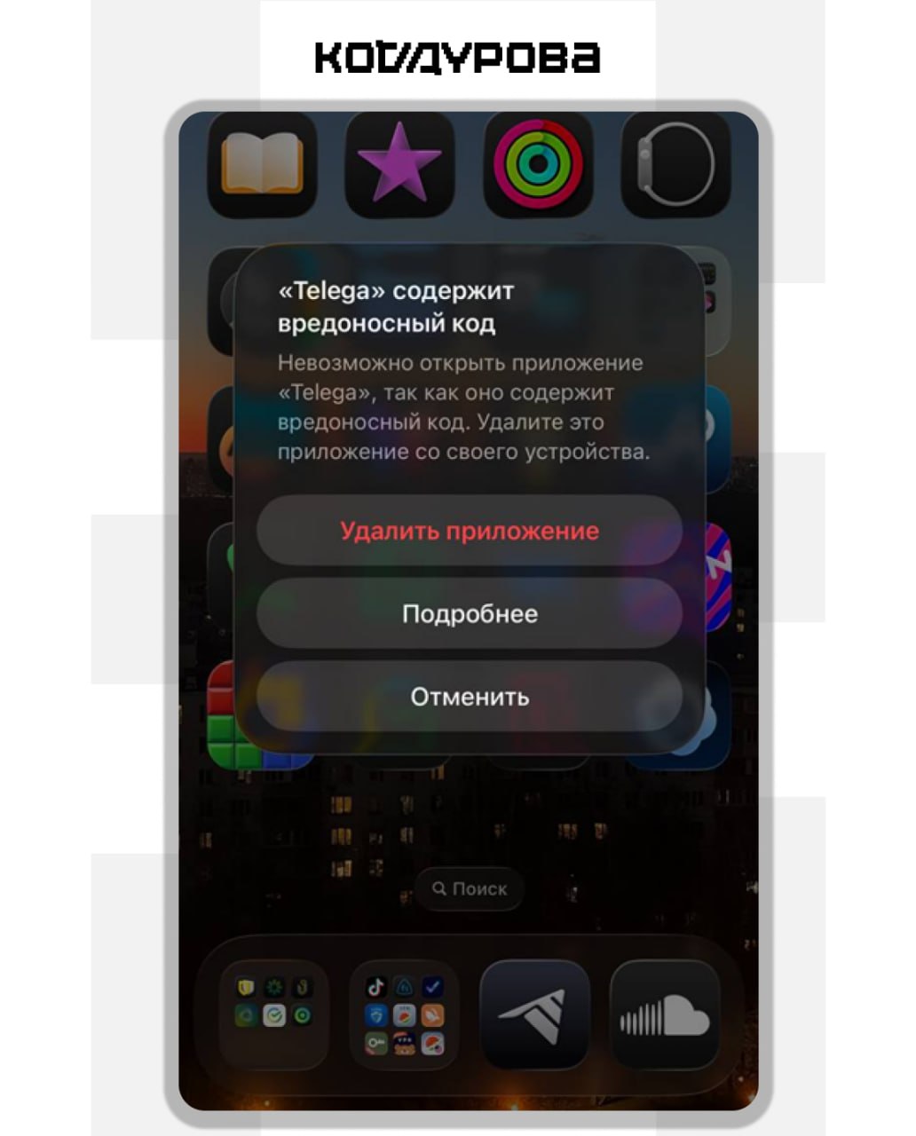 «Невозможно открыть приложение Telega, так как оно содержит вредоносный код. Удалите это приложение со своего устройства», – предупреждает iOS.