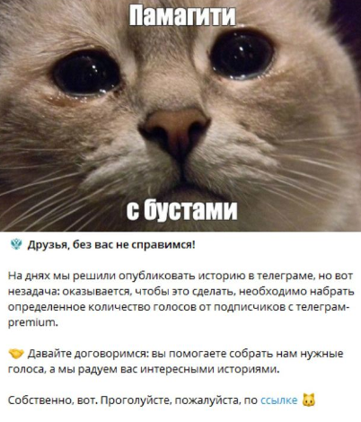 Напишите прямой пост. Объясните, зачем вам это нужно. «Ребята, хотите, чтобы наш канал начал постить крутые сторис и стал выделяться? Для этого нам нужно собрать N бустов. Если у вас есть Premium, поддержите, пожалуйста!» Люди ценят честность.