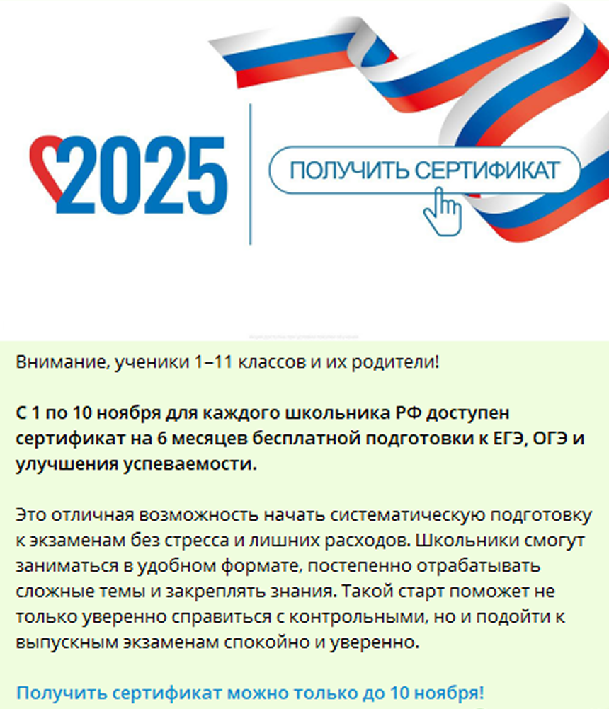 - Сертификат на бесплатную подготовку. "С 1 по 10 ноября доступен сертификат на 6 месяцев бесплатной подготовки к ЕГЭ, ОГЭ и улучшения успеваемости". Это создавало срочность и огромную ценность.