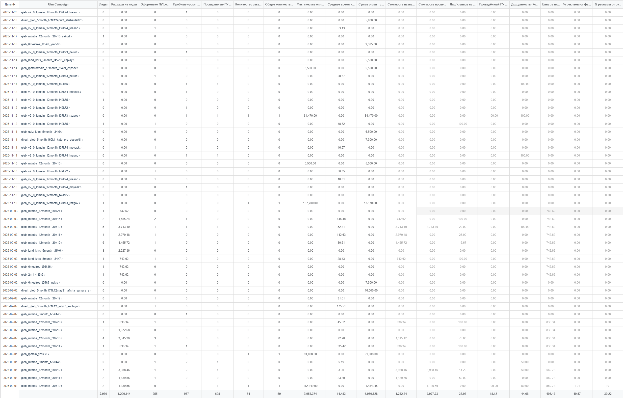 - Оформлено пробных уроков: 955 (конверсия из лида в запись ~32%).